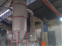 經(jīng)過初、中效過濾的環(huán)境空氣由干燥系統(tǒng)引風(fēng)機(jī)吸入熱風(fēng)空氣,與蒸汽換熱后產(chǎn)生的熱風(fēng)進(jìn)入閃蒸干燥主機(jī),與經(jīng)過螺旋加料器送入干燥主機(jī)的待干燥濾餅,在干燥主機(jī)內(nèi)完成傳熱傳質(zhì)的干燥過程,氣固混合物由旋風(fēng)分離器和布袋除塵器分離,物料被從干燥系統(tǒng)氣體內(nèi)分離出來,排出干燥系統(tǒng),尾氣由引風(fēng)機(jī)排入大氣。